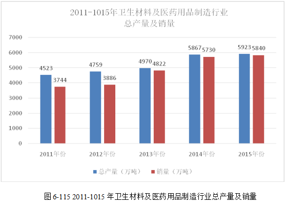 根据图6-114和图6-115可知,这近五年内,卫生材料及医药用品制造行业的企业数量虽然持续增长,但是并未有大幅度增长,增长数量波动未超过五十家。同时,总产量也保持持续增长,但是并未有大幅度增长。但是,销量占总产量的比率一直增加,到2015年,比率高达98.6%。