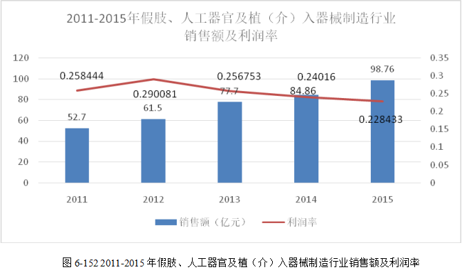 假肢、人工器官及植(介)入器械制造行业的销量增长对应着销售额的增长,但是利润率在2012年小幅度增加后却一直下降,到2015年降低至0.2284%。